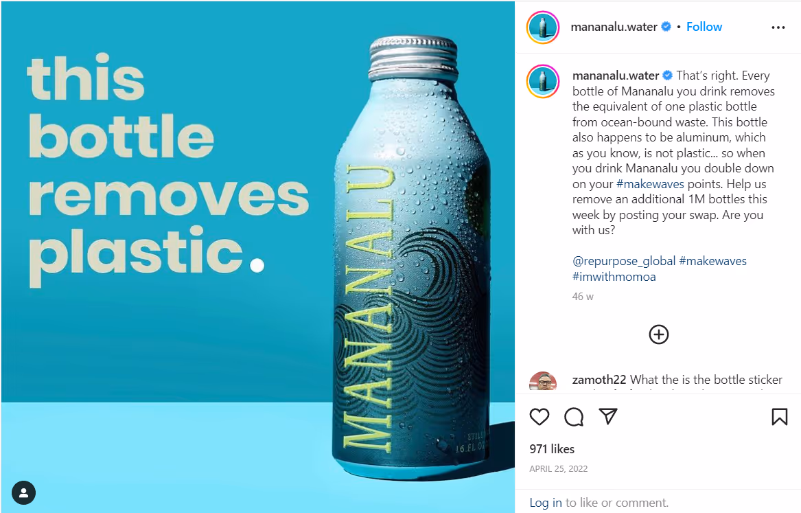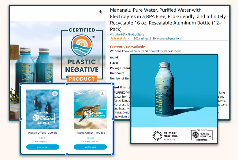 Though the Mananalu product is plastic free, they differentiate from other water brands by having an environmental mission to clean-up ocean-bound plastic waste. Their plastic recovery efforts are publicized across channels including their website, social media, and PR such as the launch of Mananalu at Whole Foods Market in March 2023. Customers can even purchase ‘plastic offsets’ of 100lbs or 200lbs via the Mananalu shop.