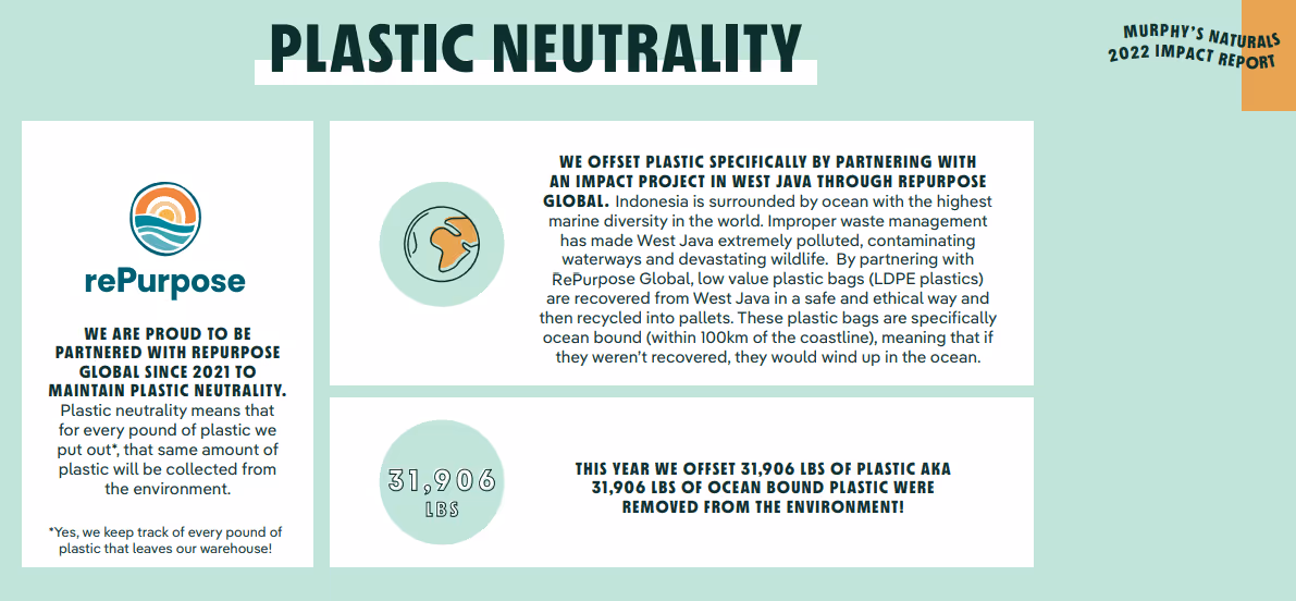 Plastic Neutrality formed an entire page of the Murphy's Naturals 2022 Impact Report, which detailed how - in 2022 alone - the brand was responsible for recovering and recycling over 30,000 lbs of ocean-bound plastic waste through rePurpose Global's project in Indonesia.