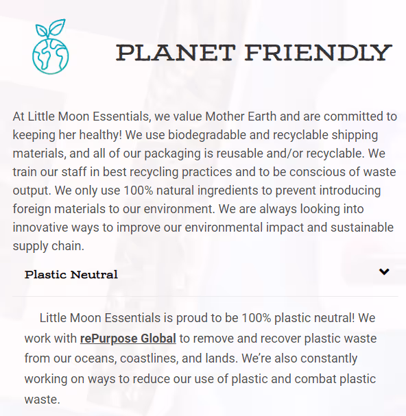 The partnership with rePurpose Global is visible on product packaging, and features on the Little Moon Essentials website and as part of their core brand messaging.