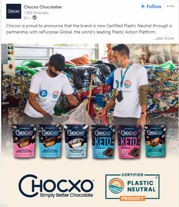 Chocxo supports rePurpose Global's impact project Project Neela Sapana in Chennai, India. Chocxo’s Plastic Neutral certification ensures that the project will collect and process around 20,000 lbs of ocean-bound plastic waste this year. This partnership was announced in a press release, on social media and launched at Natural Products Expo West.