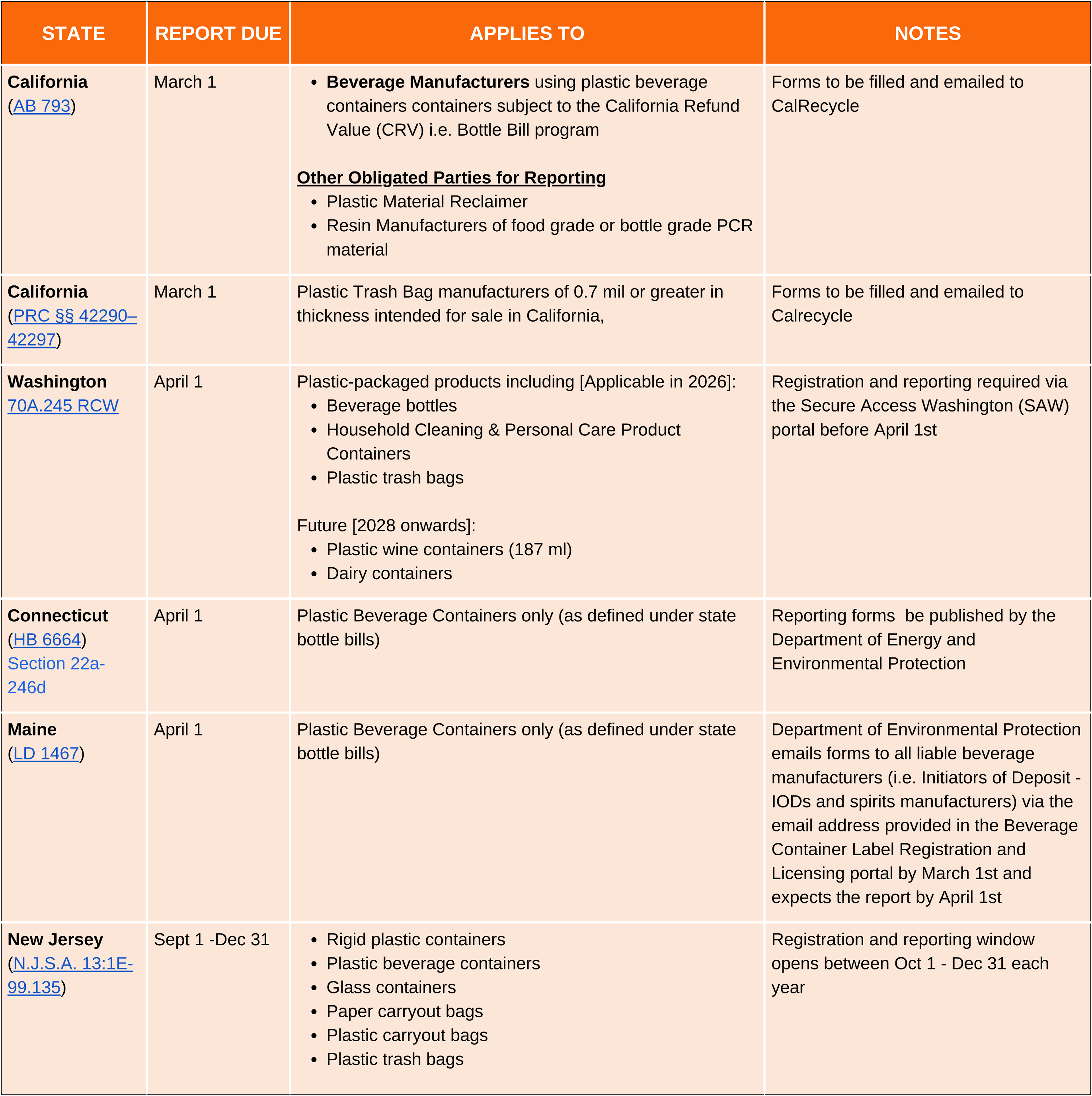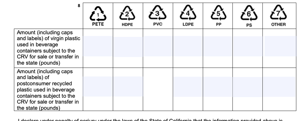 Manufacturers of plastic beverage containers sold in California must report by March 1st each year with the following data for the prior calendar year: