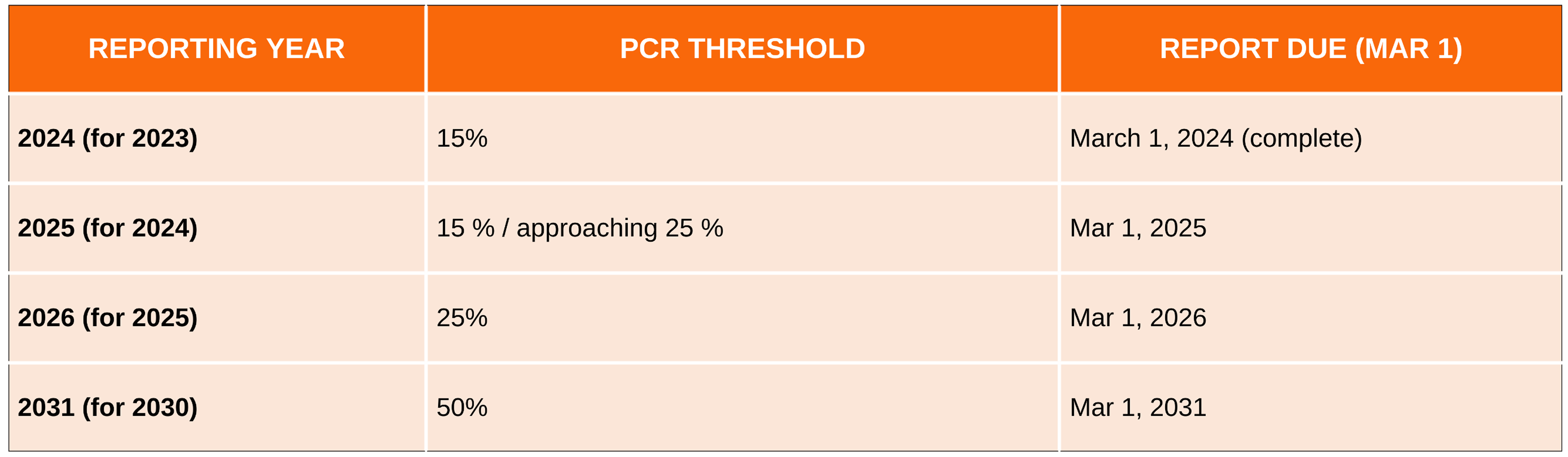 Note: The 2025 threshold increases to 25 %, legally binding on Jan 1, 2025, and PCR data for that year will be reported by March 1, 2026.