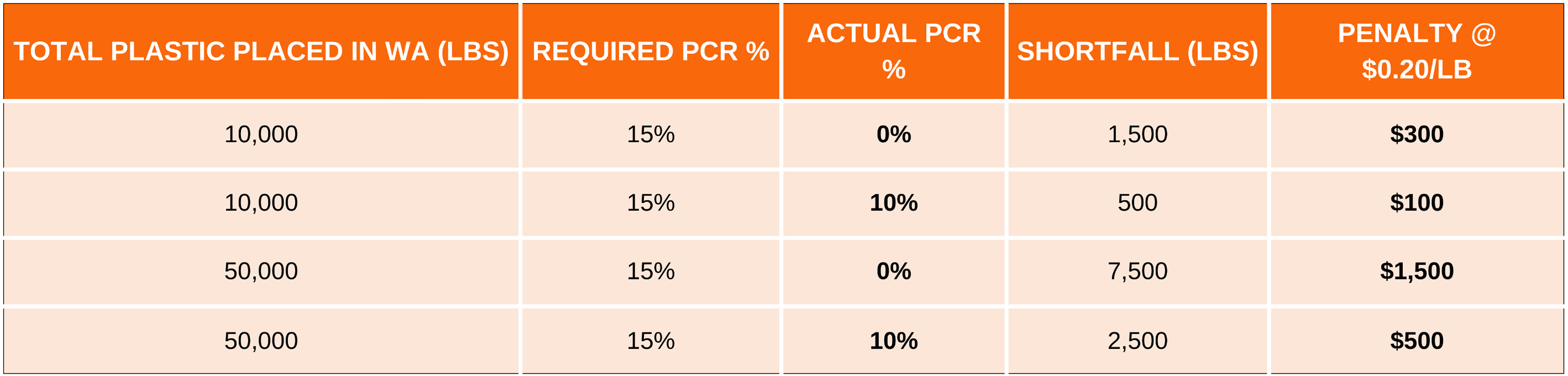 - Penalty rate: $0.20 per pound of shortfall (i.e., the difference between required PCR pounds and actual PCR pounds used).