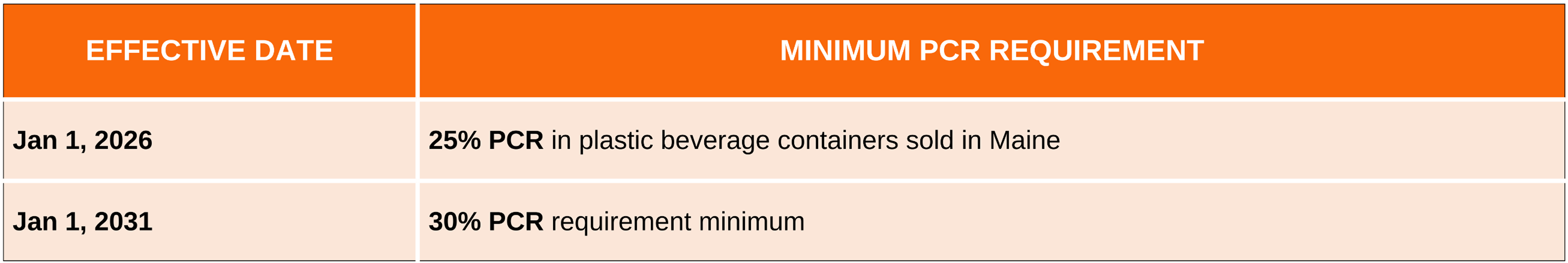 - Plastic beverage containers: (PET/HDPE, etc.): 15% (2023) → 25% (2026) → 50% (2031)