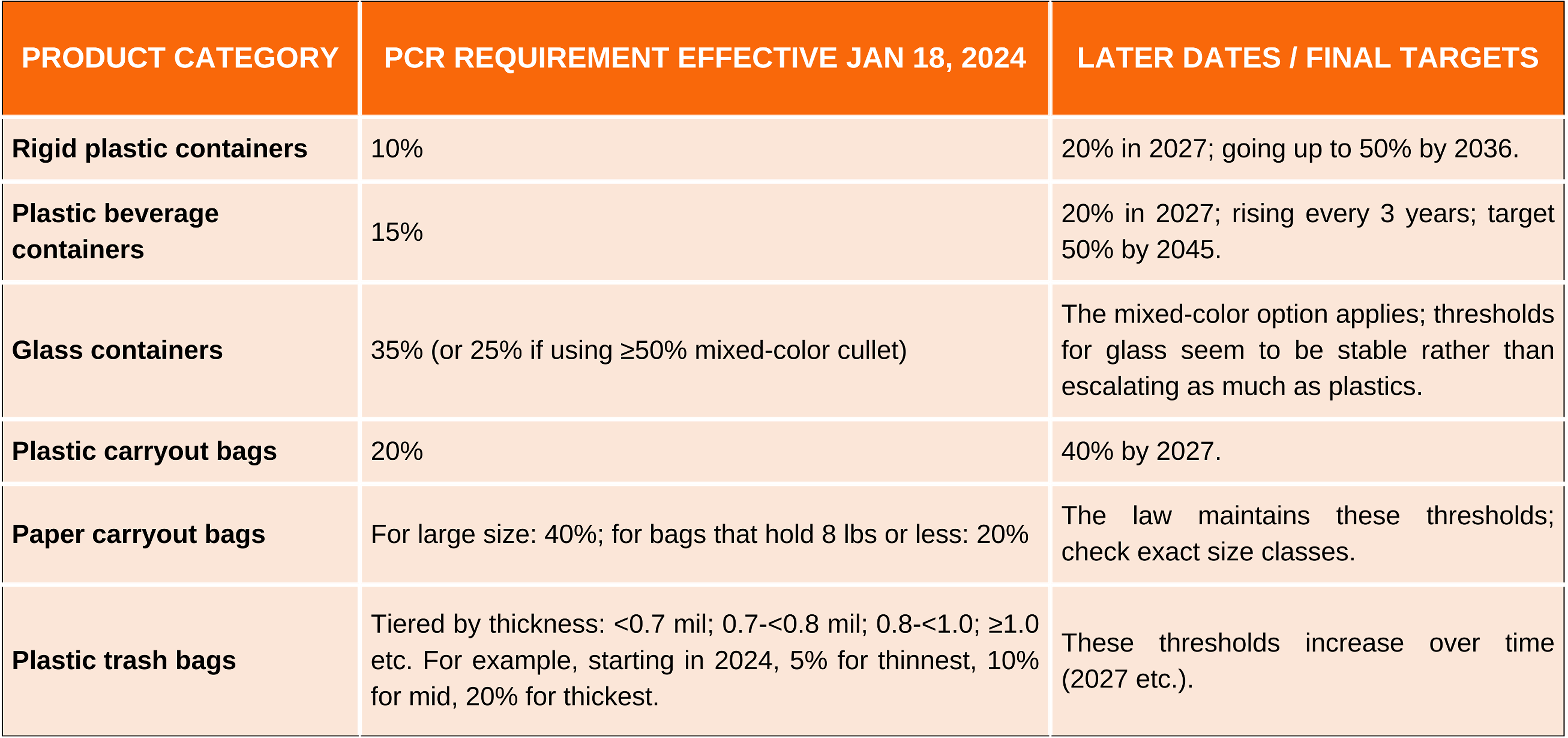 The law phases in PCR thresholds over several years (starting 2024), varying by product category. Some highlights: