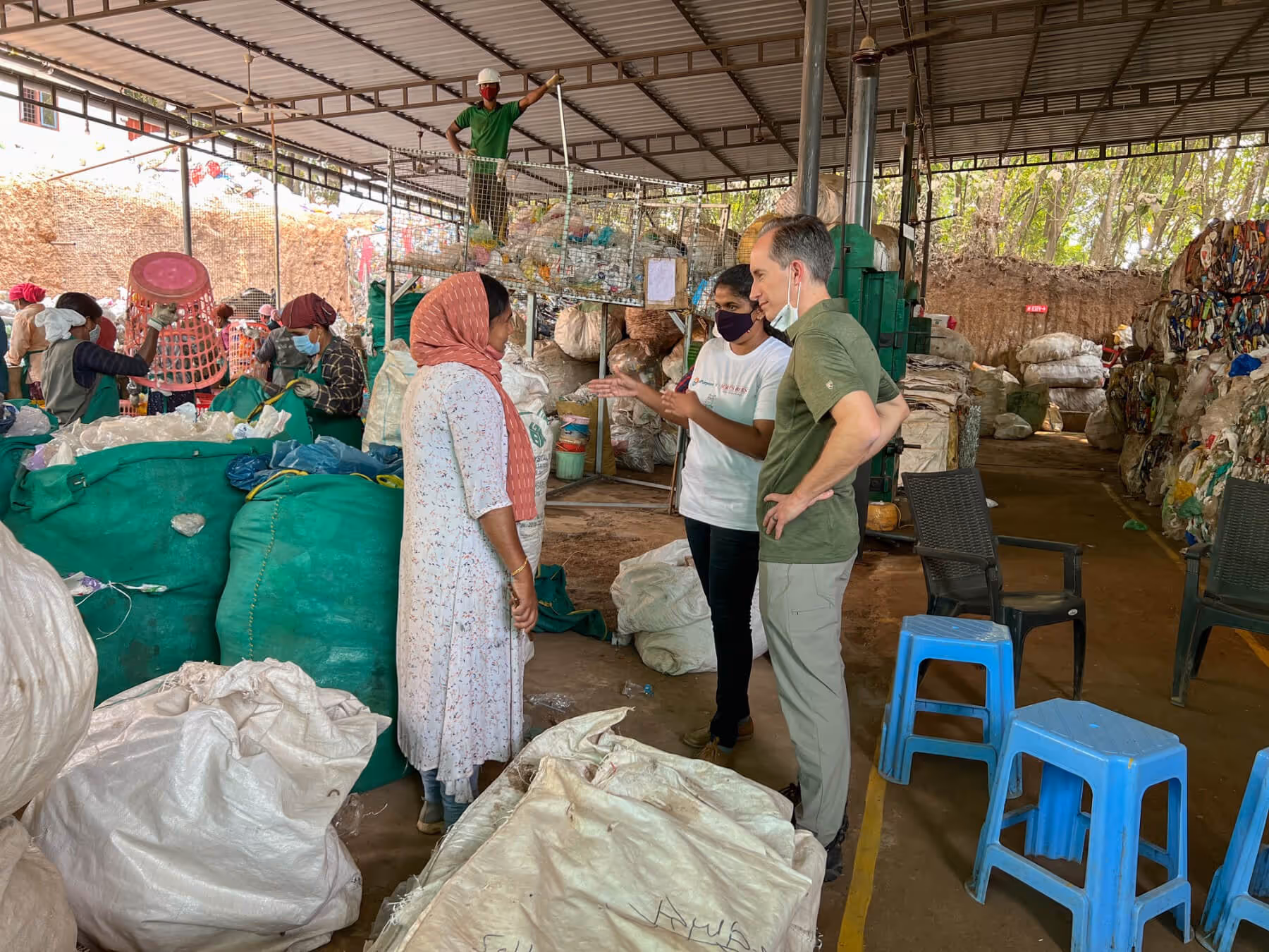 I traveled to multiple sites in India, including a sorting facility in the village of Agricole, where I visited with 36 segregators. Jalsa, the head of the women’s cooperative employed at the facility, explained that the facility focused on mixed flexible plastics, sorting them into specific streams before baling and sending them off for coprocessing. Thanks to the joint intervention by rePurpose Global and Green Worms, the women’s incomes are well above a standard Indian blue-collar wage. This is driven largely by plastic credit financing, which provides a premium for multilayered plastic, thus shifting the economics and making collection worthwhile.