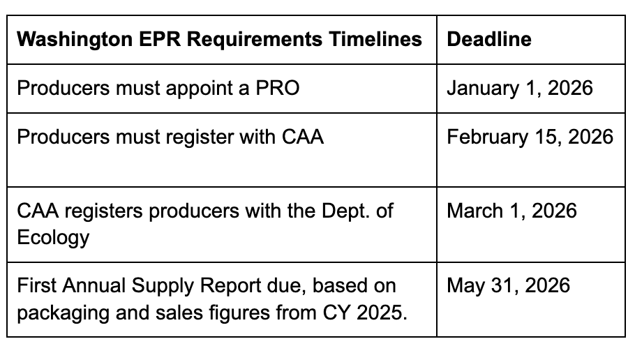Washington’s packaging Extended Producer Responsibility law — the Recycling Reform Act (RCW 70A.208) — requires producers to join a PRO by January 1, 2026, register with the PRO by February 15, 2026, and then be registered by the PRO with the Department of Ecology by March 1, 2026.