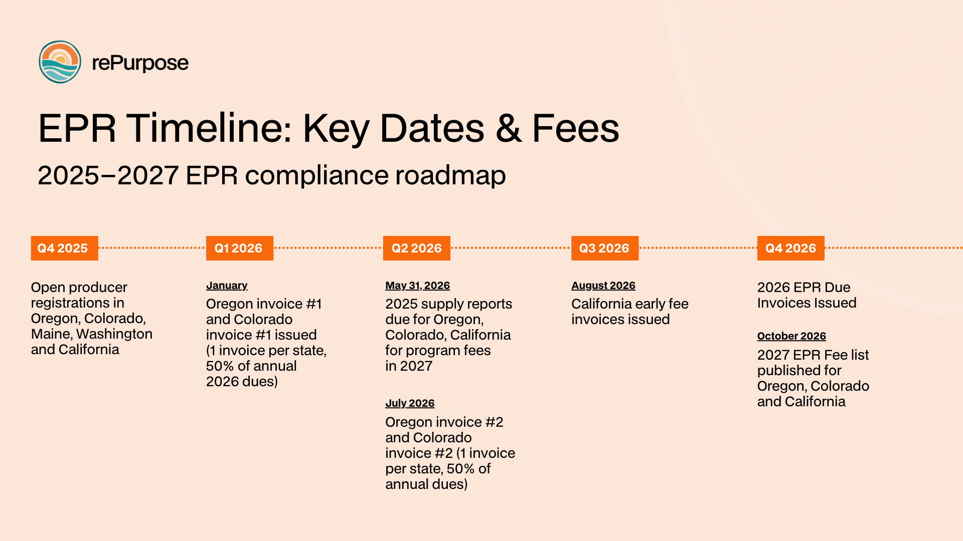 Oregon, the earliest mover, began its EPR program in July 2025. Producers obligated in Oregon already submitted 2025 supply data on March 31, 2025 and paid fees in mid-2025.